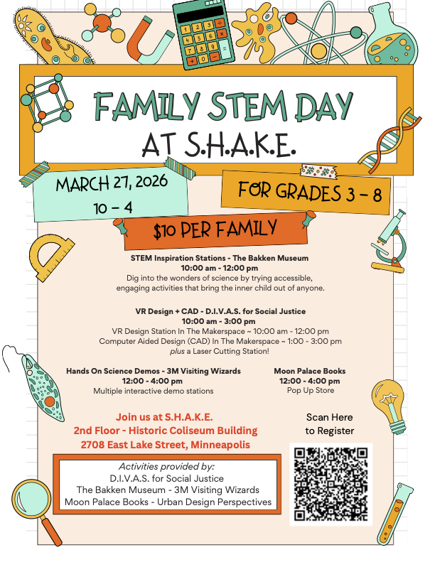 Urban Design Perspectives is hosting this special event at S.H.A.K.E. at the Coliseum in partnership with D.I.V.A.S. for Social Justice, The Bakken Museum, 3M Visiting Wizards, and Moon Palace Books.